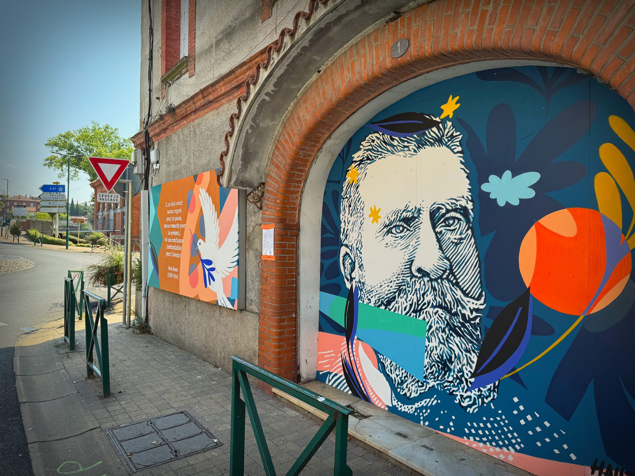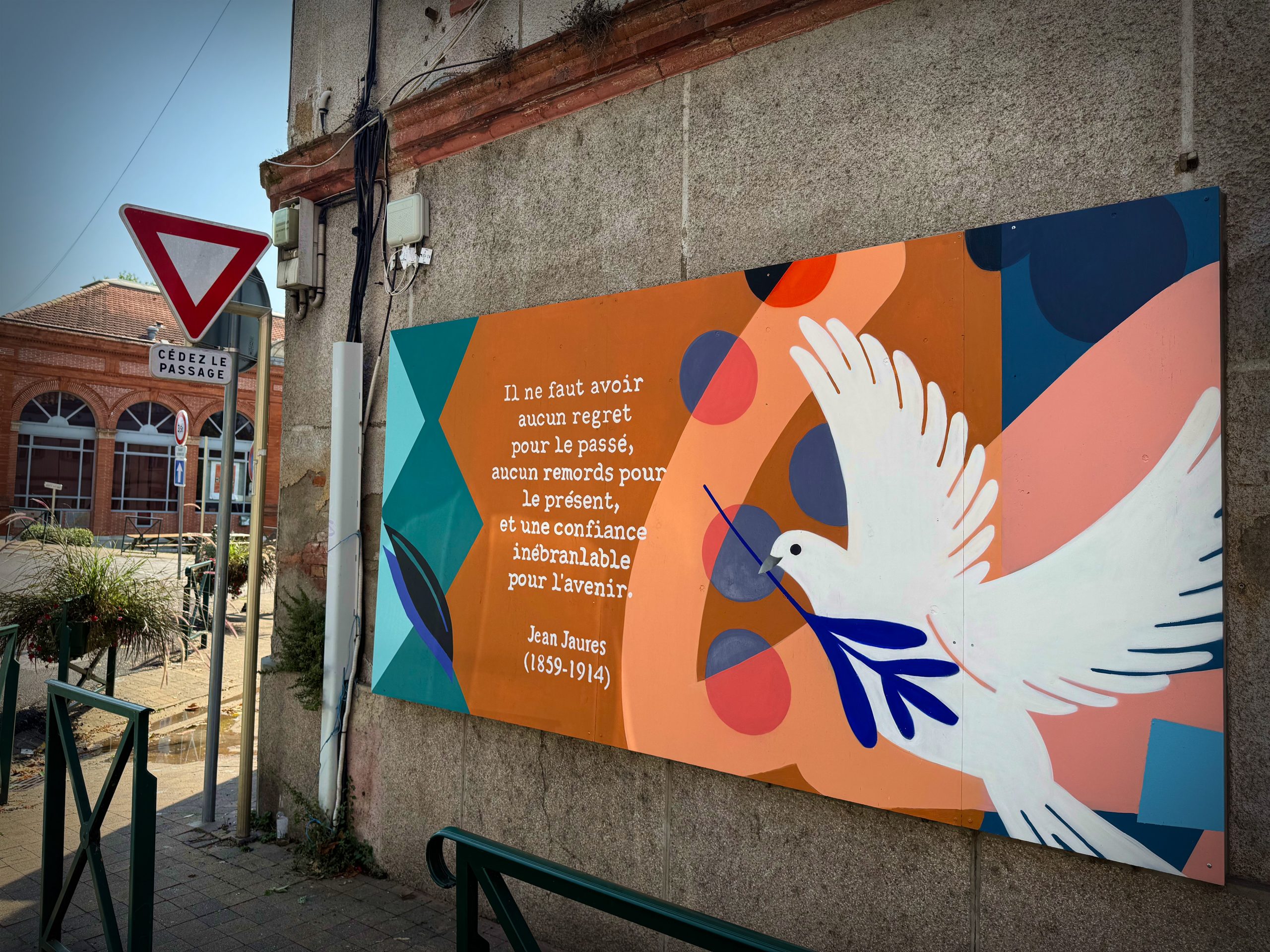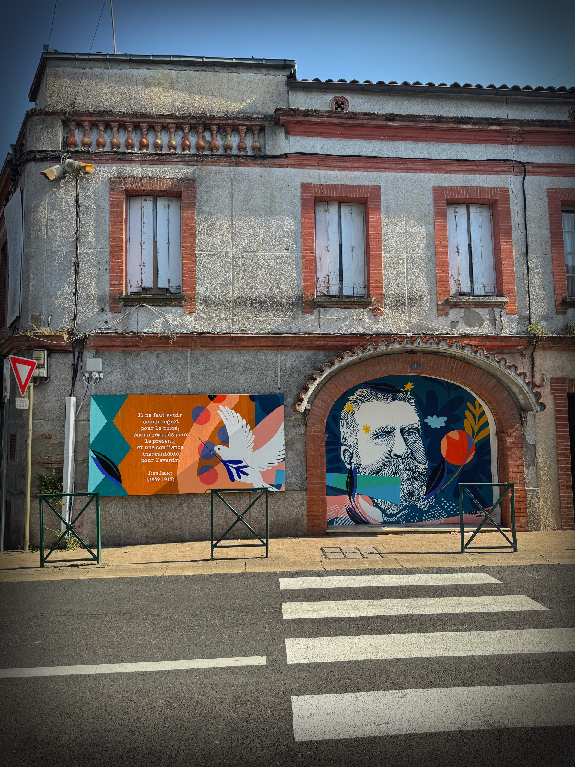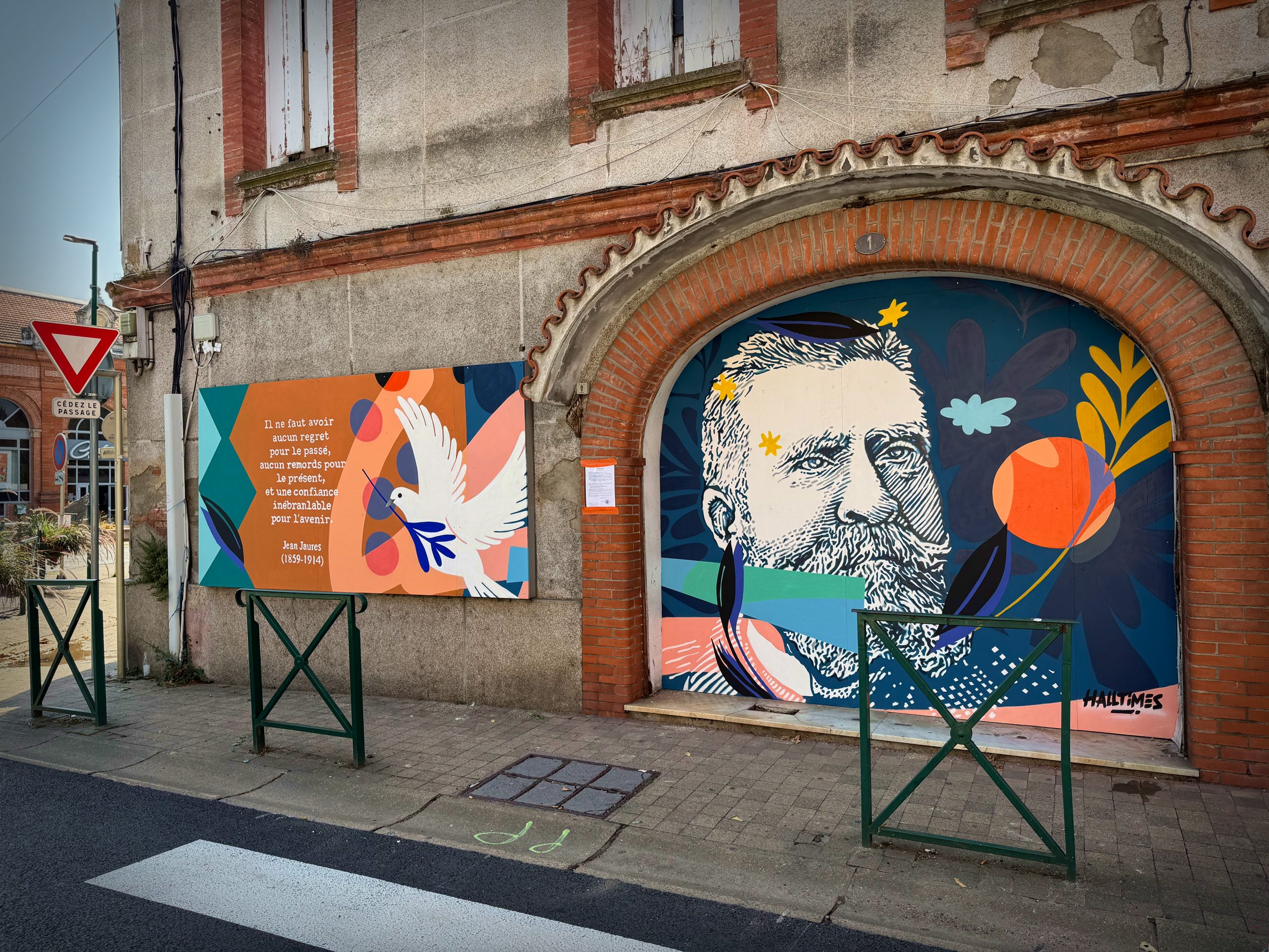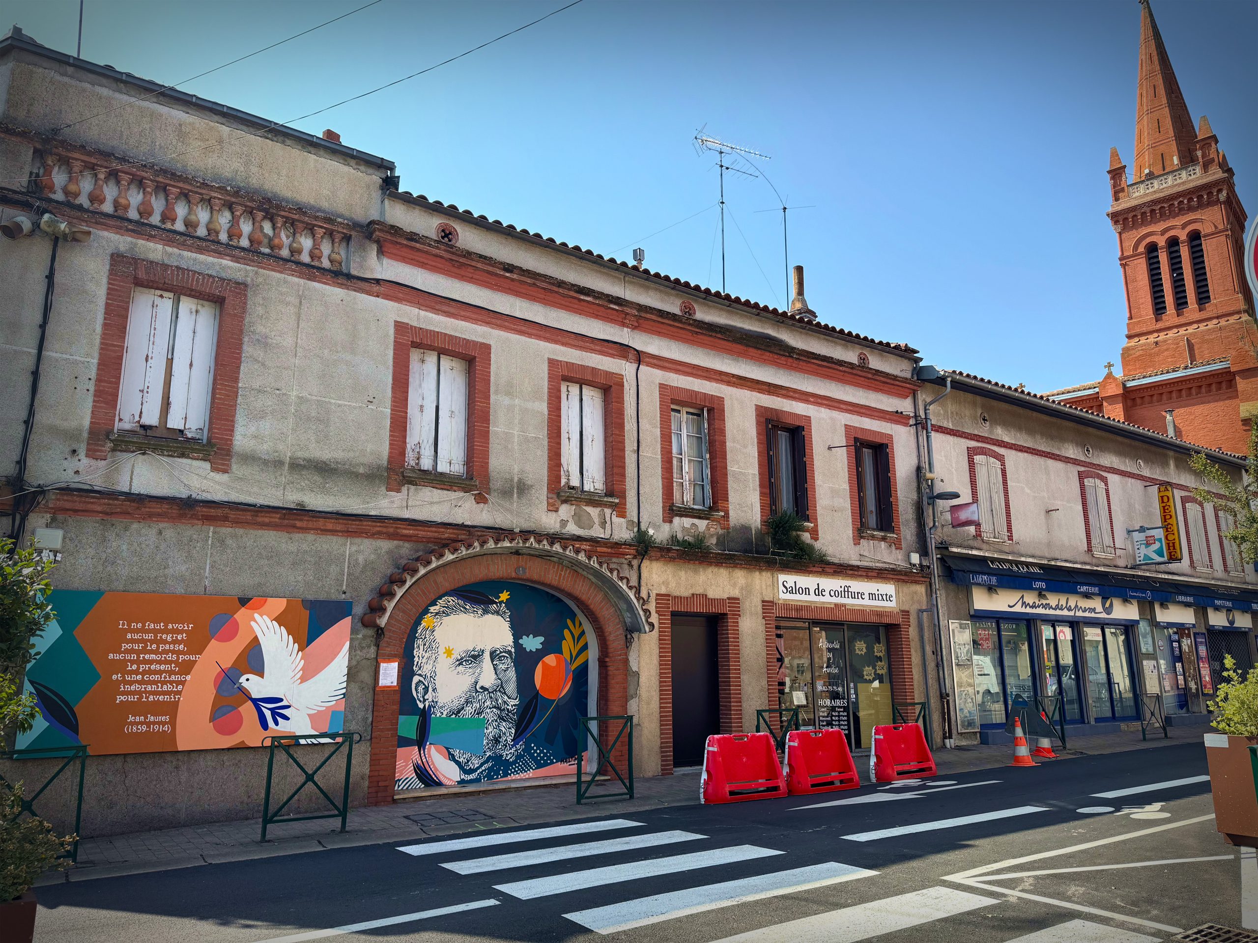 En écho au nom de la rue, la fresque sur Jean Jaurès évoque les valeurs humanistes, républicaines et de solidarité.