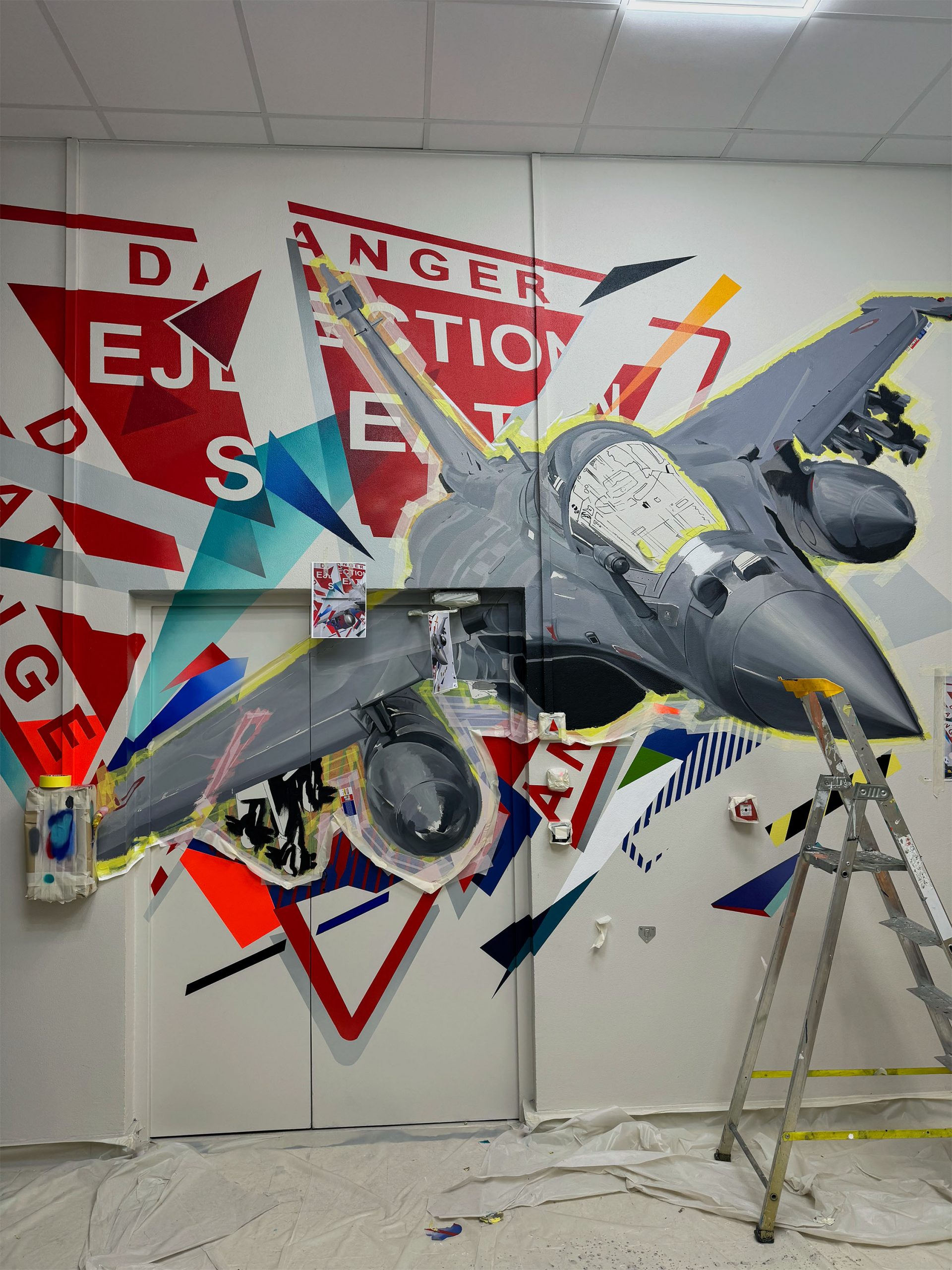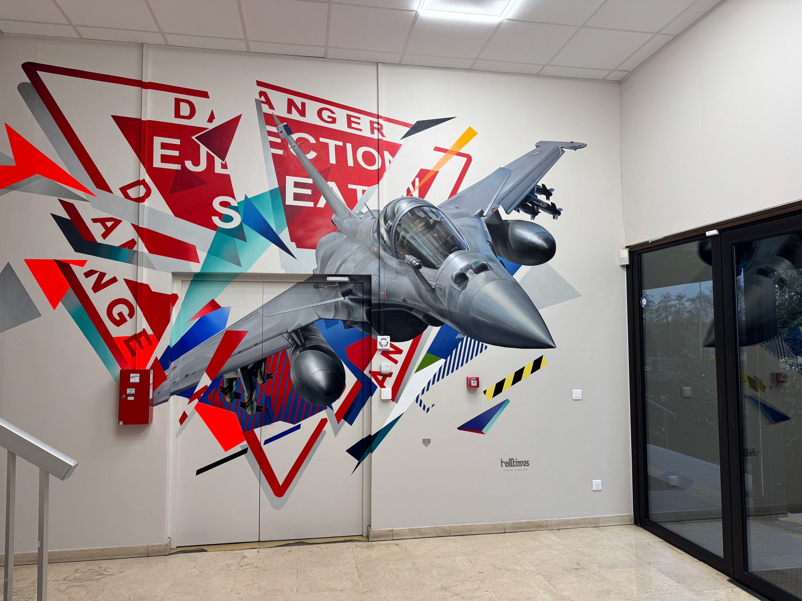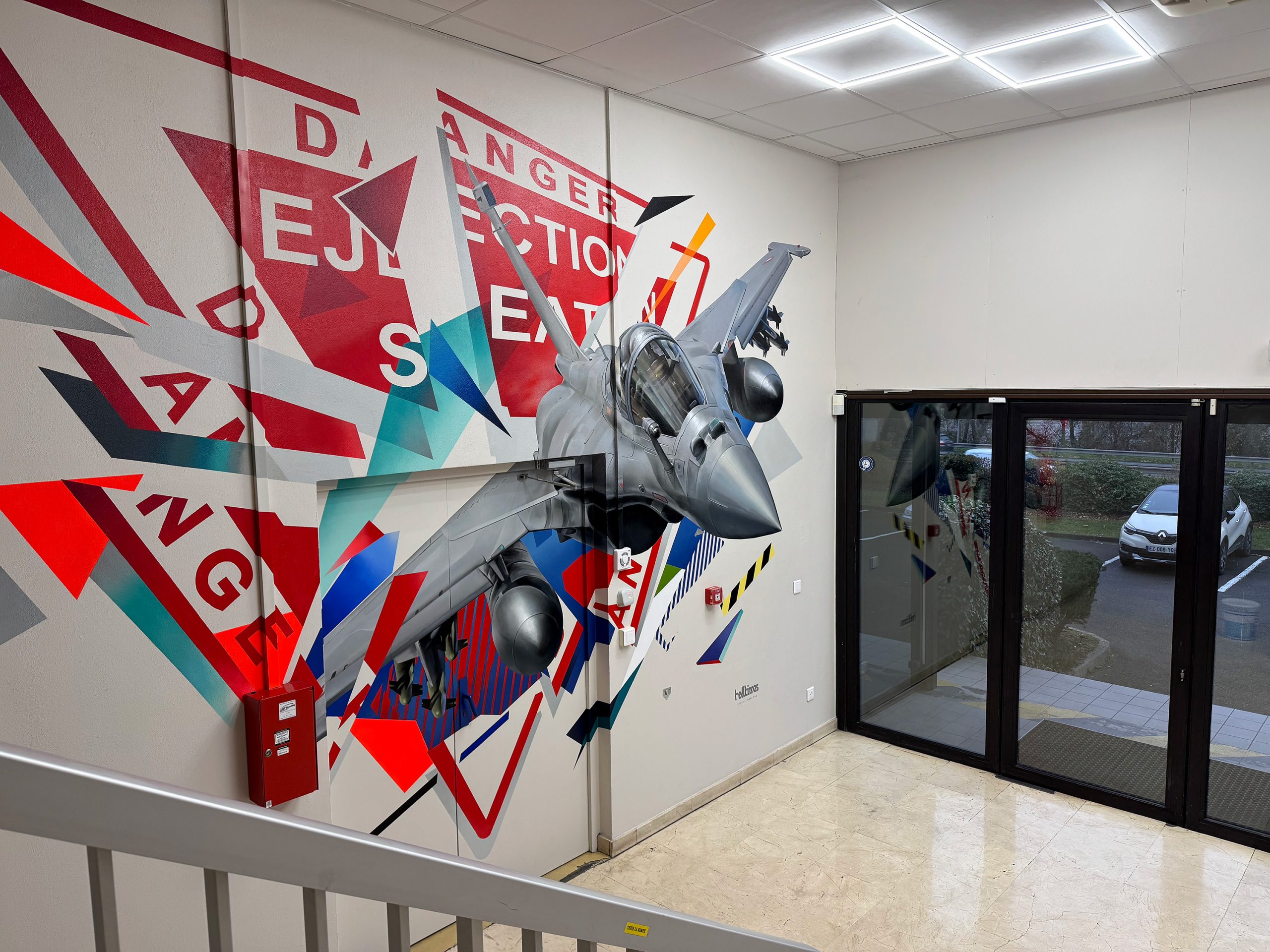 L’ambition artistique était de symboliser le progrès de l’industrie et notamment la mission de l’entreprise « sauver des vies » avec la représentation d’un rafale dans le ciel qui ne s’arrête pas ou qui grâce à la fiabilité de son siège éjectable permet aux pilotes de rester en vie. On discerne la plaque « EJECTION SEAT » sigle que l’on retrouve sur les sièges. Le code couleur de la fresque fait aussi référence à la poignée d’éjection permettant la propulsion du pilote en cas de danger imminent. Un clin d’œil graphique ! Pour conclure, le HALLTIMES STUDIO est fier d’avoir pu apporter sa griffe artistique au cœur d’une telle entreprise !