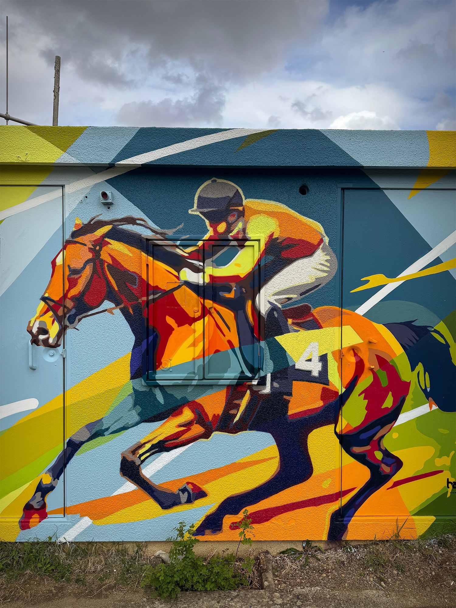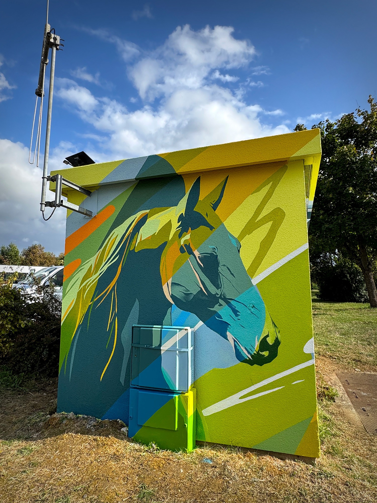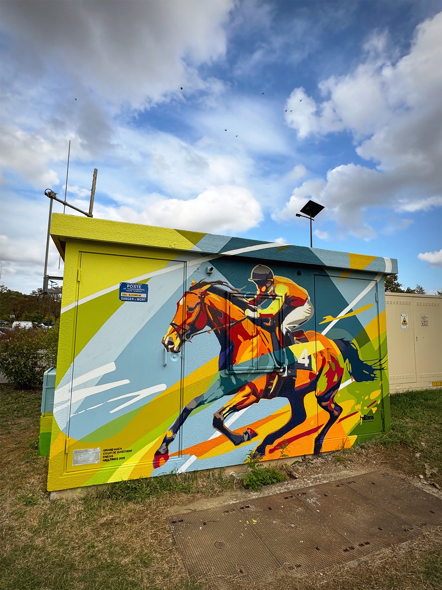L’agence HALLTIMES n’en est pas a son coup d’essai en matière de customisation de transformateurs. Dans le Gers à Auch, 3 fresques viennent d’apparaître. Au parc commercial LE GRAND CHENE dans la zone industrielle du Mouliot on y découvre un double poste revêtu d’une fresque aux couleurs vives représentant un chêne au milieu d’un alliage de formes graphiques, signature de l’artiste graffeur Julien AVIGNON. Adjacente à la zone du Mouliot, la zone d’activités Engachies accueille également une fresque sur un transformateur. Celle-ci représente un paysage avec collines et vallons sur un fond de couleur terracotta. Et pour finir, une dernière fresque murale est visible sur la route de l’hippodrome. Elle reflète l’élégance de la course hippique et des chevaux, avec un jockey en effort vers la victoire.