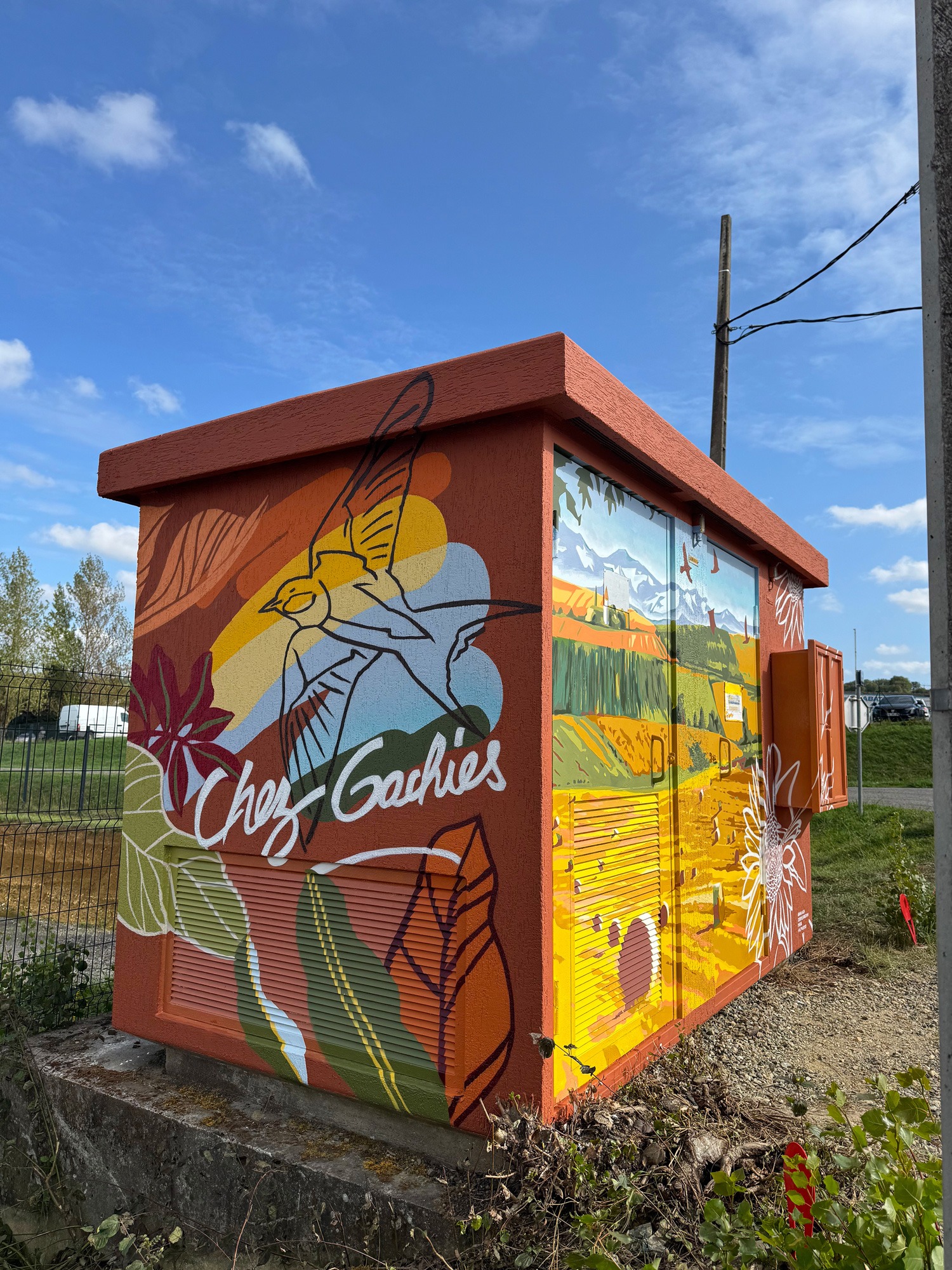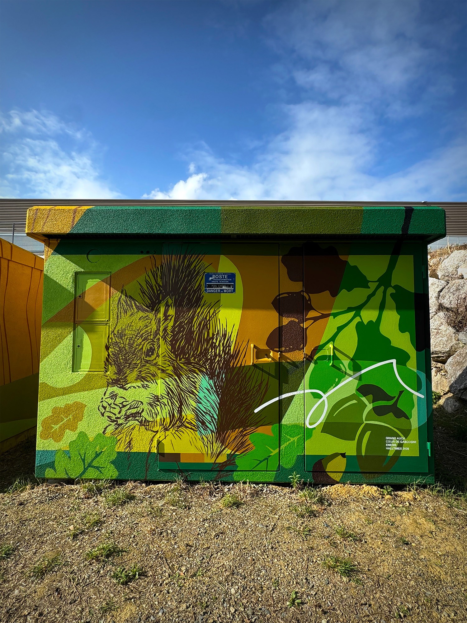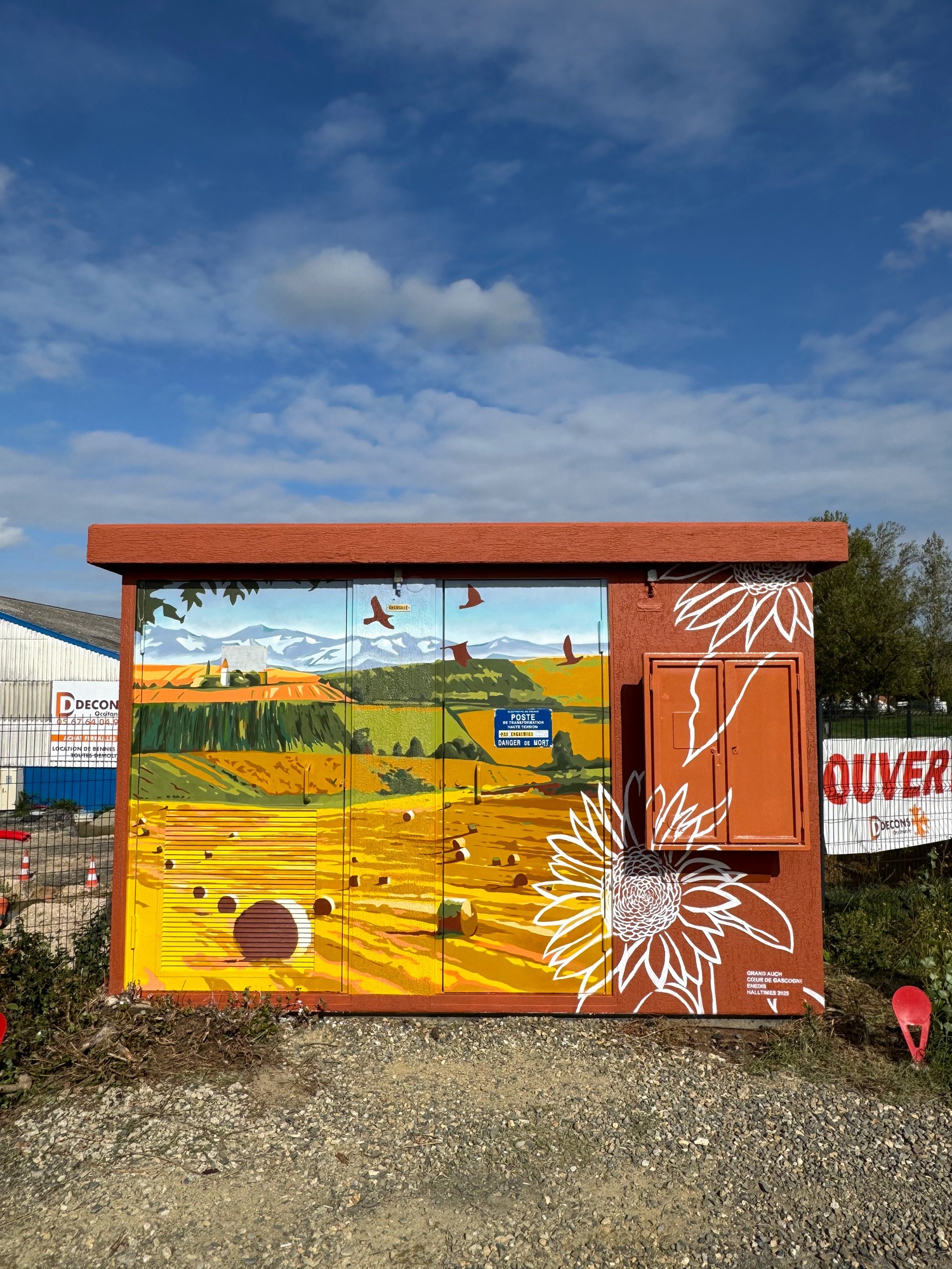 L’agence HALLTIMES n’en est pas a son coup d’essai en matière de customisation de transformateurs. Dans le Gers à Auch, 3 fresques viennent d’apparaître. Au parc commercial LE GRAND CHENE dans la zone industrielle du Mouliot on y découvre un double poste revêtu d’une fresque aux couleurs vives représentant un chêne au milieu d’un alliage de formes graphiques, signature de l’artiste graffeur Julien AVIGNON. Adjacente à la zone du Mouliot, la zone d’activités Engachies accueille également une fresque sur un transformateur. Celle-ci représente un paysage avec collines et vallons sur un fond de couleur terracotta. Et pour finir, une dernière fresque murale est visible sur la route de l’hippodrome. Elle reflète l’élégance de la course hippique et des chevaux, avec un jockey en effort vers la victoire.